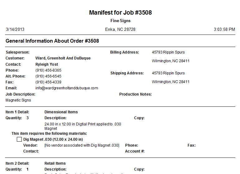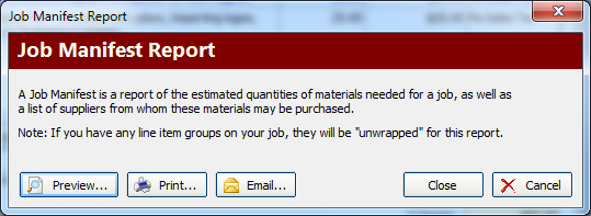 | Job Manifest | Print a detailed report of what materials in what quantity are needed for a specific job so you can check stock and place orders if necessary. |