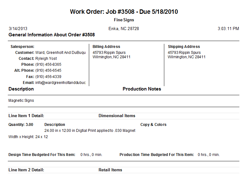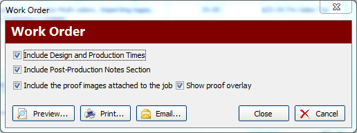 | Work Orders | Print work orders showing in detail what needs to be done for each item on the job ticket. You can also (optionally) include estimated design and production times on the work order. |
